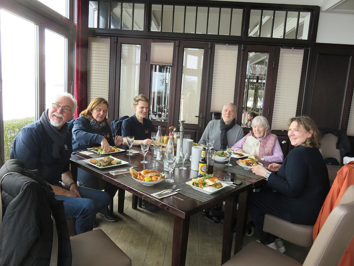 Als wir am Ufer der Kieler Förde ankamen, wartete auf uns schon eine freundliche Bedienung, und wir bekamen einen schönen Extraraum mit einem wunderschönen Blick aufs Wasser. Ein paar Frachter glitten übers Wasser, und es wurde schnell ein gemeinsames Gespräch gefunden. Frau S. hat vier Kinder großgezogen und lebte noch bis zum letzten Jahr zusammen mit einem von den Kindern zu Hause und wurde köstlich bekocht. Das ging nach ihrer schweren Erkrankung leider nicht mehr.