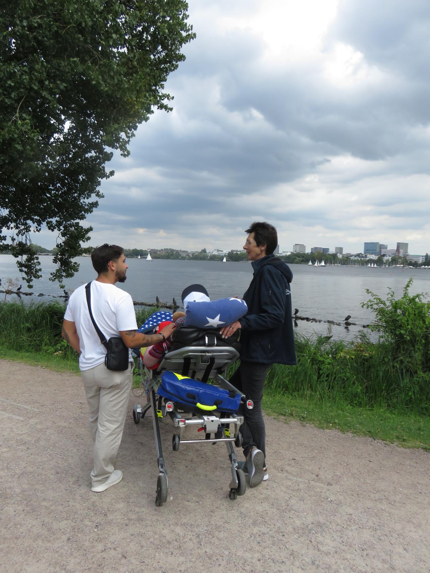 Ein neuer Plan wurde geschmiedet: Die Außenalster. Dort angekommen, suchten wir uns ein stilles Plätzchen, weit weg vom Lärm der Stadt. Die Sonne spiegelte sich sanft im Wasser, und eine kühle Brise wehte über uns hinweg. Wir platzierten Marcels Trage so, dass er die Natur in vollen Zügen genießen konnte. Der Kontrast zwischen dem energiegeladenen Festival und der ruhigen Umgebung war beinahe greifbar. Die Hektik der letzten Stunden wich einer tiefen Gelassenheit, die sich über die gesamte Gruppe legte.