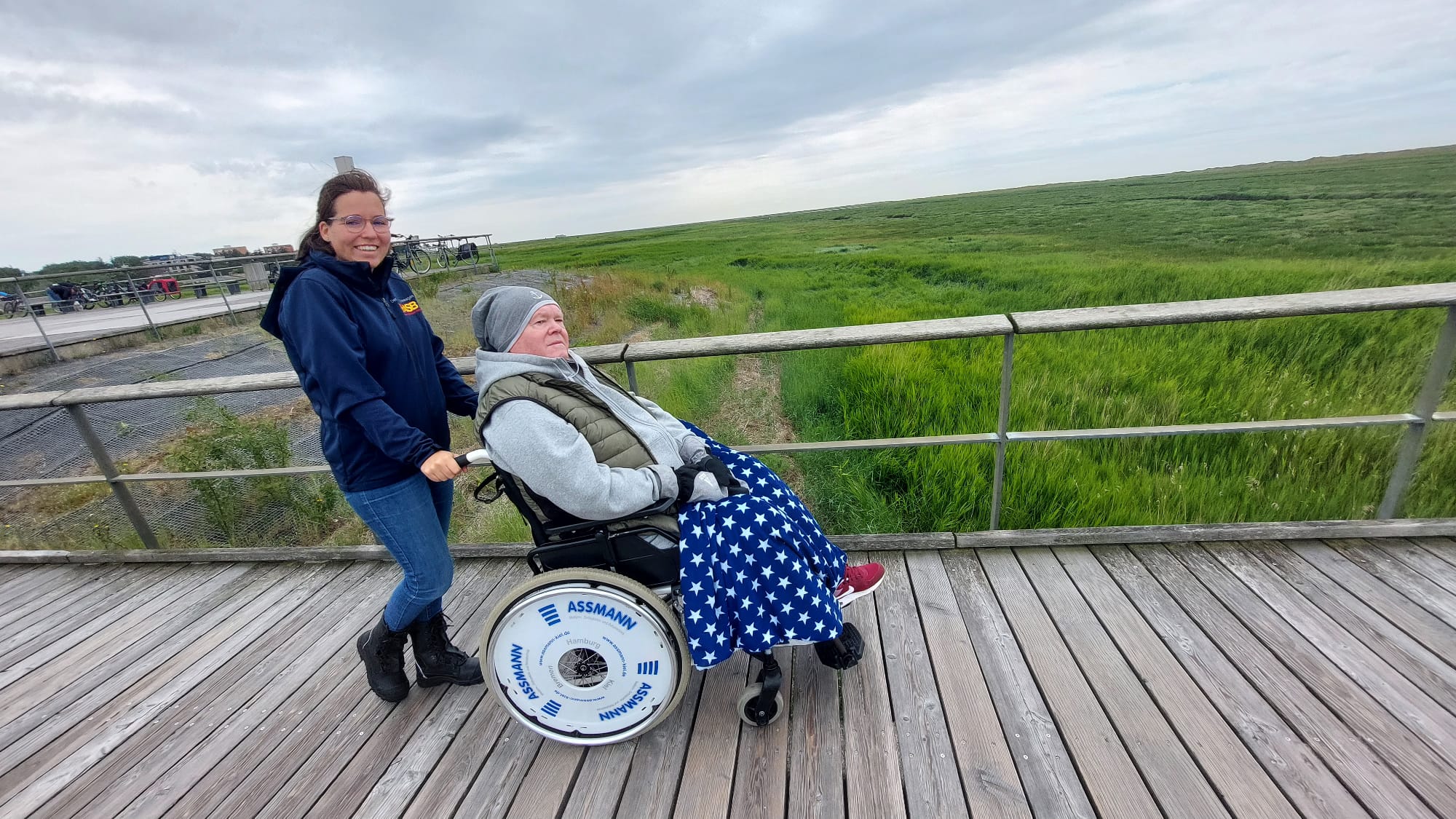 Dann ging unsere Reise weiter nach St. Peter Ording. Dort angekommen kamen alte Erinnerungen hoch an schöne Urlaube mit ihren zwei Hunden. Wie lange waren sie nicht mehr raus gekommen durch die schwere Krankheit unseres Fahrgastes, der von seiner Ehefrau gepflegt wird. Wir gingen die Seebrücke entlang, mit einigen Pausen. Was für eine herrliche Aussicht! Man spürte, dass unser Fahrgast etwas wehmütig wurde, aber die Seeluft offensichtlich sehr genossen hat.