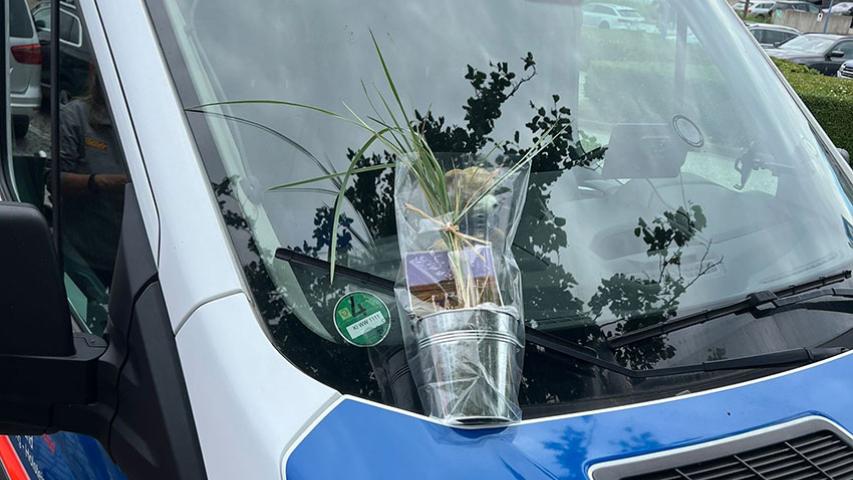 Nun ließ doch so langsam die Kraft nach, und wir machten uns auf den Rückweg. Auf dem Parkplatz erwartete uns noch eine Überraschung, eine uns unbekannte Frau machte uns darauf aufmerksam, dass sie uns etwas hingestellt hatte, als Dank für unsere Arbeit. Wir haben uns sehr gefreut – was für eine Wertschätzung!