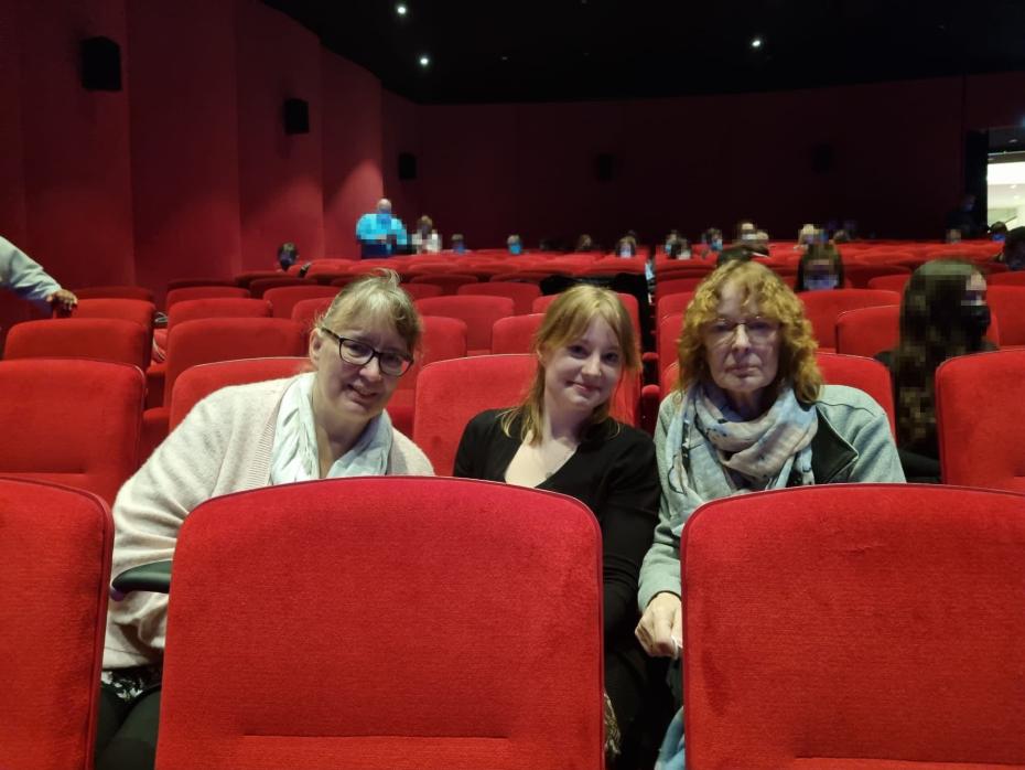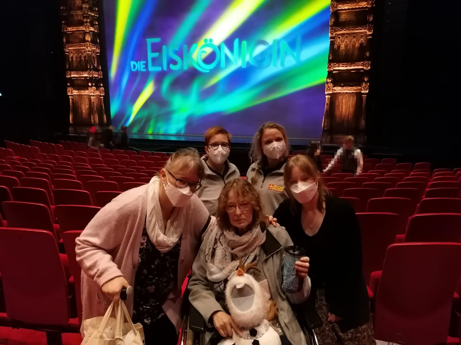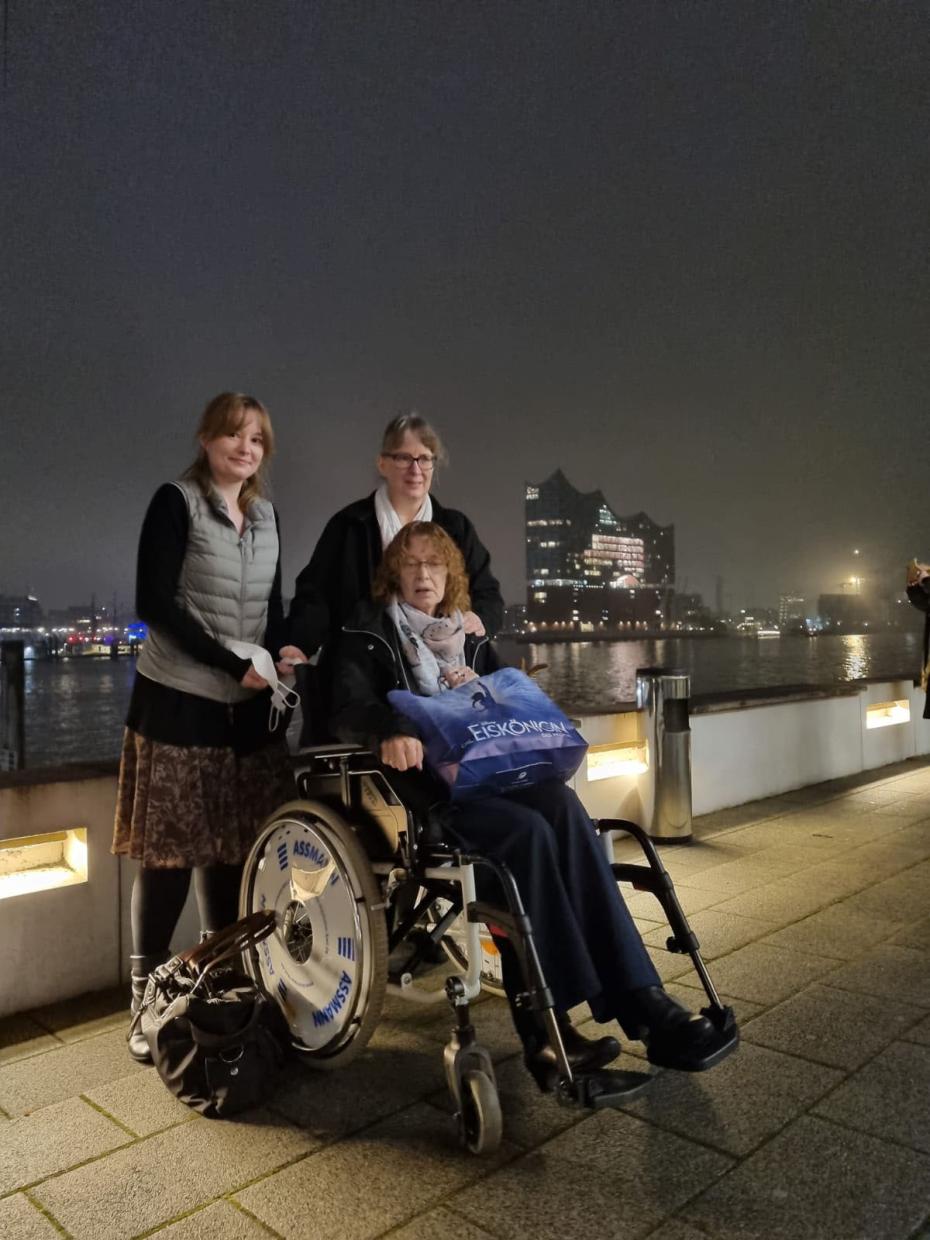 Endlich geht es weiter und schließlich kommen wir am Musicalgelände an, die Aufregung steigt, wir holen den Rollstuhl aus dem Auto, legen die Eintrittskarten und Impfnachweise bereit und helfen Edith aus dem Auto in den Rollstuhl – geschafft, wir sind pünktlich da und machen noch ein paar Erinnerungsfotos auf dem Gelände vor dem Theater. In den Gesprächen während der Fahrt und auch jetzt geht es immer wieder um die gemeinsame Kindheit der beiden Schwestern mitten in Hamburg, ganz in der Nähe des Hamburger Doms sind sie aufgewachsen. Von weitem blicken wir über die Elbe und sehen das Riesenrad auf dem Winter Dom.