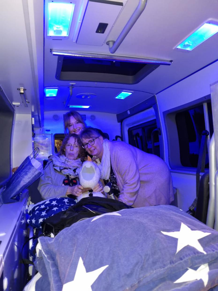 Vorsichtig und mit Unterstützung bewältigt Edith die Treppen aus dem ersten Stock nach unten. Ich gehe vor und bereite den Wünschewagen vor. Edith ist froh, dass sie es sich mit unserer Sterndecke und ihrer eigenen auf der Liege im Wünschewagen gemütlich machen kann. Sie freut sich sehr und bedankt sich über das bereitgelegte Herzkissen als Geschenk. Ihre Tochter und die Schwester setzen sich zu Edith, ich erkläre noch schnell, wie Heizung und Licht funktionieren und versorge alle mit Süßigkeiten und Getränken aus unserem kleinen Kühlschrank, und dann starten wir unsere Fahrt Richtung Hamburg. Zunächst kommen wir gut voran, alle sind gut gelaunt, die drei sind sehr vertraut, unterhalten sich viel und es wird gelacht. Und dann passiert das, was wir jetzt gar nicht gebrauchen können. Ein Stau nach Unfall, alles dicht, wir stehen still – nur gut, dass wir noch etwas Zeitpuffer haben.