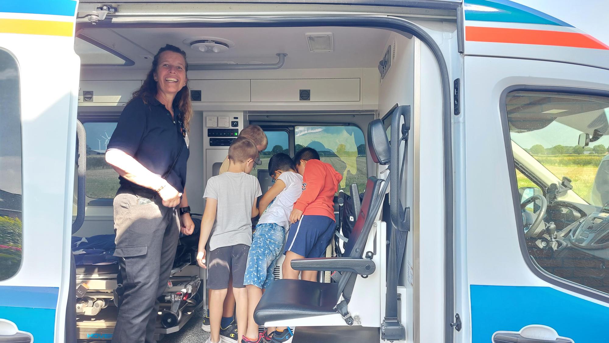 Wir Wunscherfüllerinnen machten einen kleinen Spaziergang, damit die Familie auch etwas Zeit alleine mit ihr hatte. Als wir wieder am Haus ankamen, erwartete uns eine kleine neugierige Gruppe von Kindern, die unseren Wünschewagen besichtigen wollten. Natürlich haben wir das möglich gemacht, und jeder durfte sich Naschi aus der Minibar im Wünschewagen nehmen.