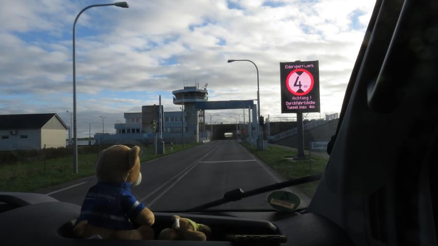 Die erste Pause machten wir am Eider-Sperrwerk. Dort konnten wir die Kraft des Wassers beobachten. Denn es war gerade Flut und das Nordsee-Wasser floss mit großer Geschwindigkeit in die Eider.
