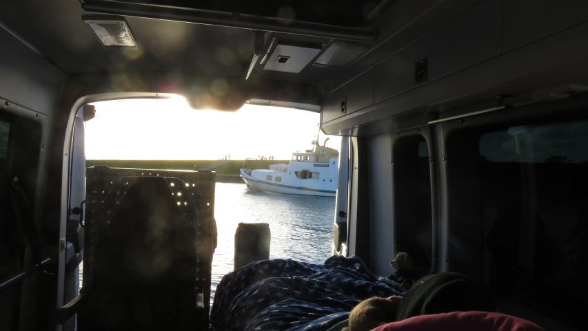 Für die Seebrücke war es noch zu windig und Herr T. zu müde. Darum entschieden wir gemeinsam mit unserem Fahrgast, nach Büsum direkt ans Wasser zu fahren. So musste er nicht aussteigen. Hans-Rudolf fuhr nah an die Wasserkante. Mit dem Blick aufs Wasser öffneten wir die hinteren Türen. Die Sonne kam raus und kitzelte Herrn T. wach. Er konnte gemütlich aus dem Wünschewagen beobachten, wie kleinere Schiffe an uns vorbeifuhren. Anschließend fuhren wir wieder zurück.