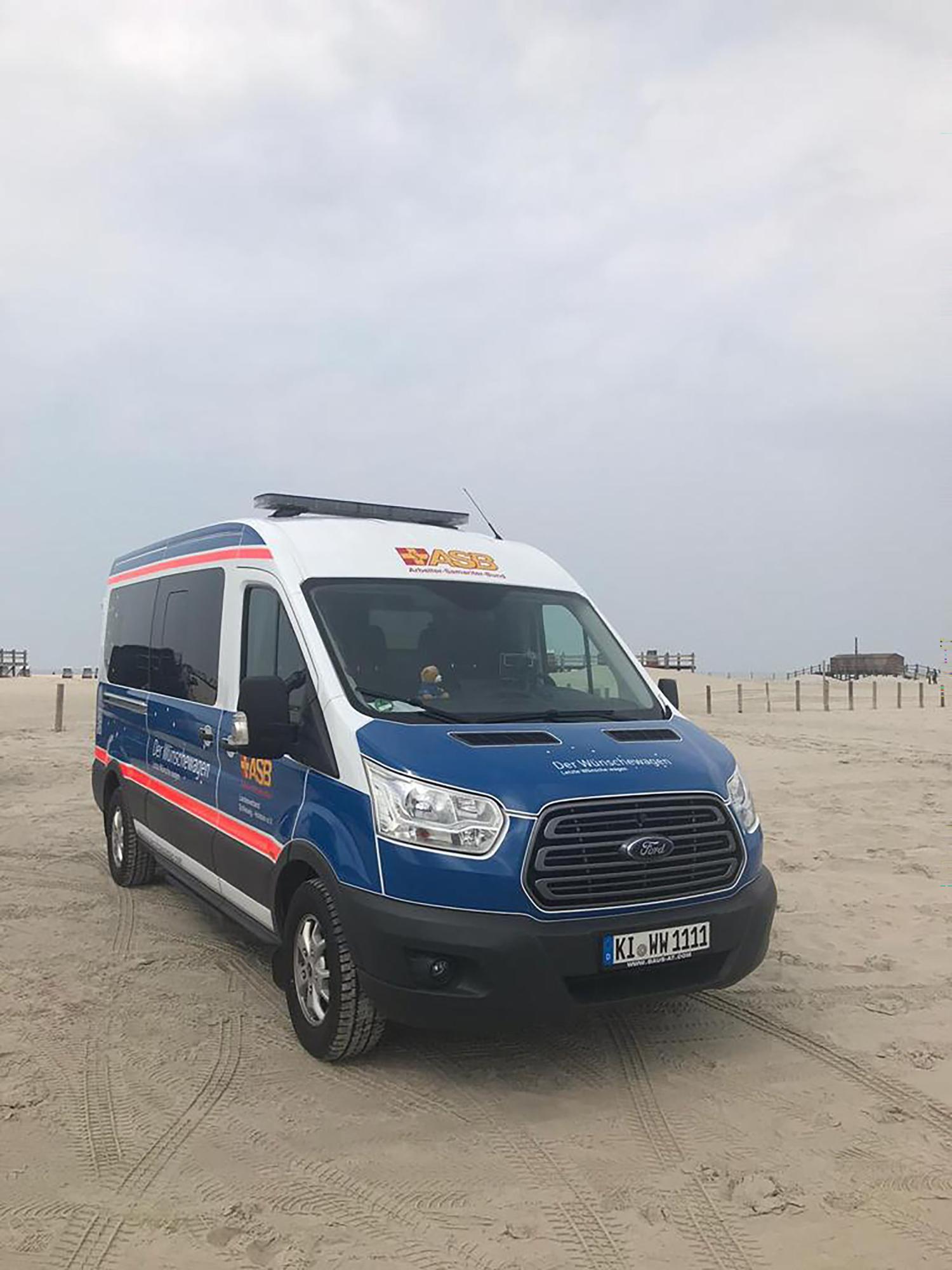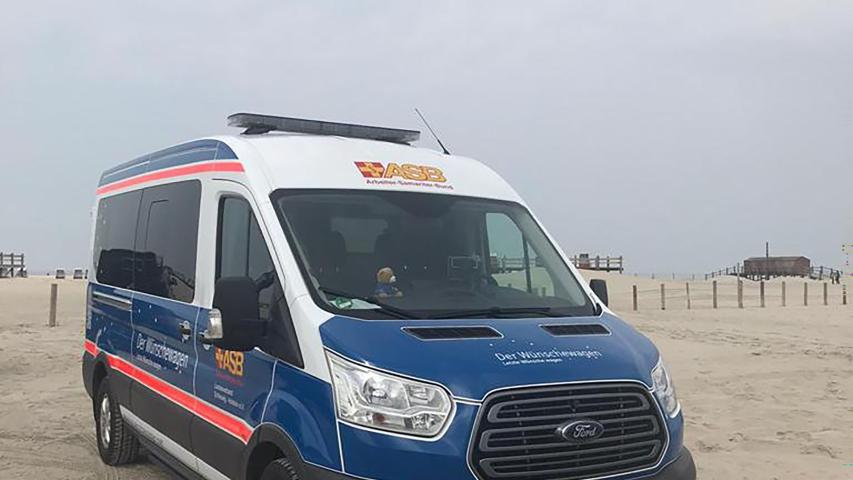 Bei starkem Regen begann dieses Mal die Fahrt nach Sankt Peter-Ording. Am Hospiz warteten Herr T. und seine Familie bereits auf unsere Wunscherfüller:in Kristina und Hans-Rudolf. „Hoffentlich wird das Wetter besser“, sagte unser Fahrgast. Sie waren schon abfahrbereit und voller Freude. Herr T. versuchte eigenständig in den Wünschewagen einzusteigen, doch die Beine wollten nicht wie er. Kein Problem, denn dafür haben wir unsere bequeme Fahrtrage.
