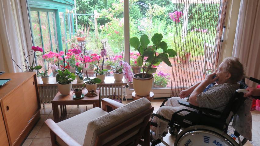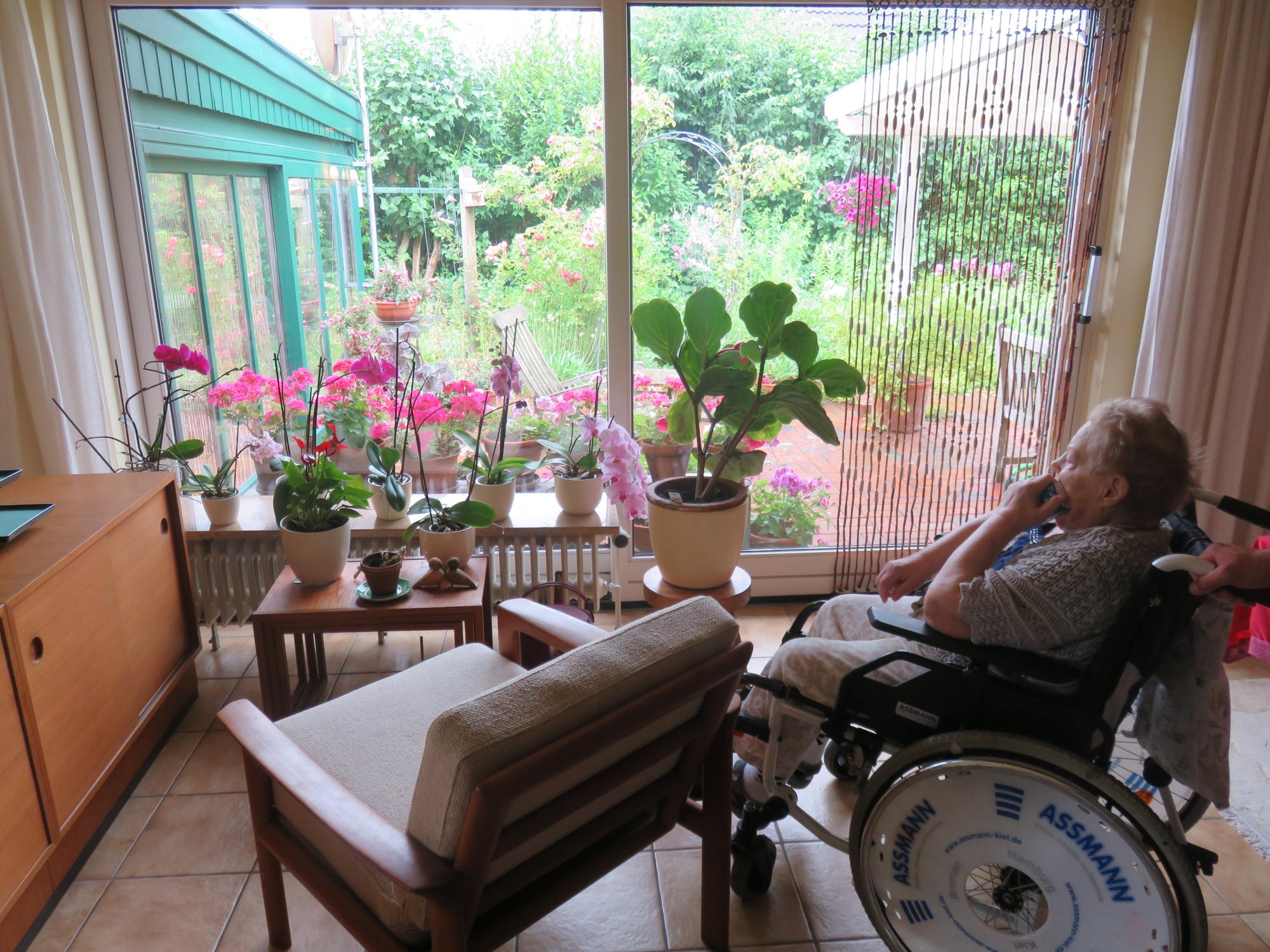 Im Garten angekommen, leuchteten Frau Rohrs Augen heller als jede Blüte. Besonders die Rosen, die sich bis in den Walnussbaum hinaufrankten, ließen sie staunen. Auch die prachtvollen 14 Geranien und ganze 13 Orchideen in voller Blüte rührten sie tief – ein farbenfrohes Fest für die Seele.