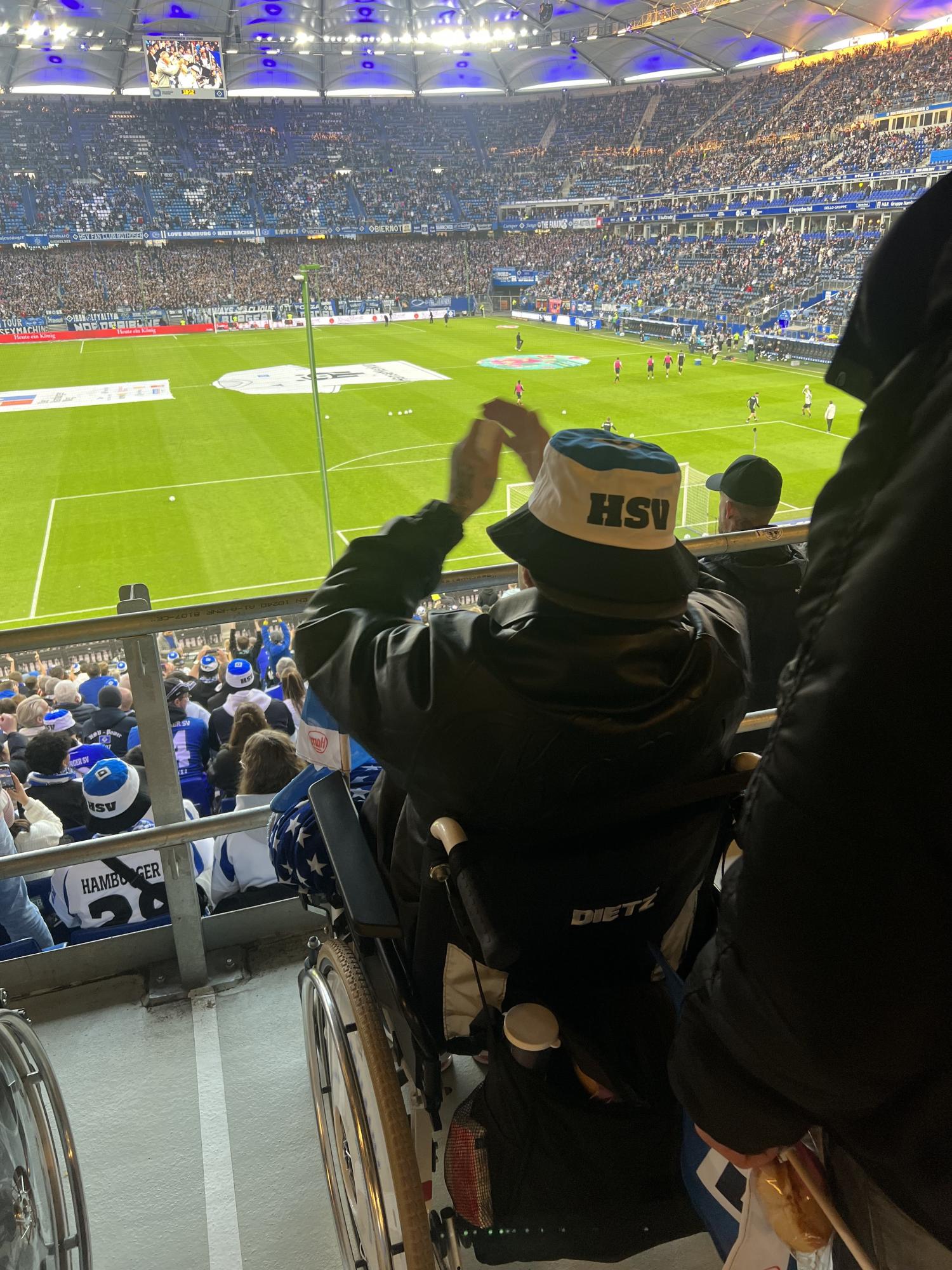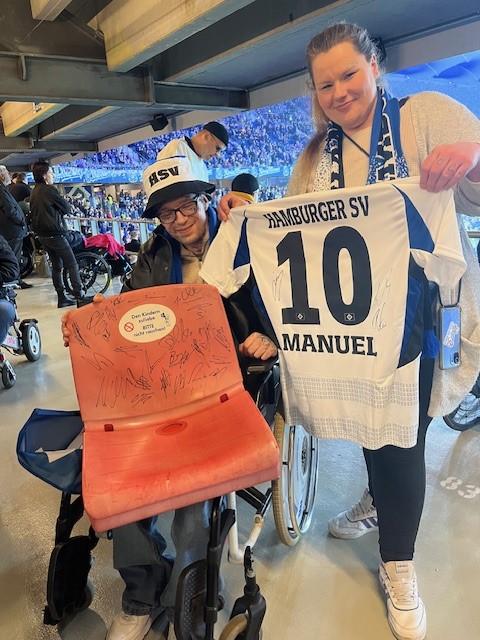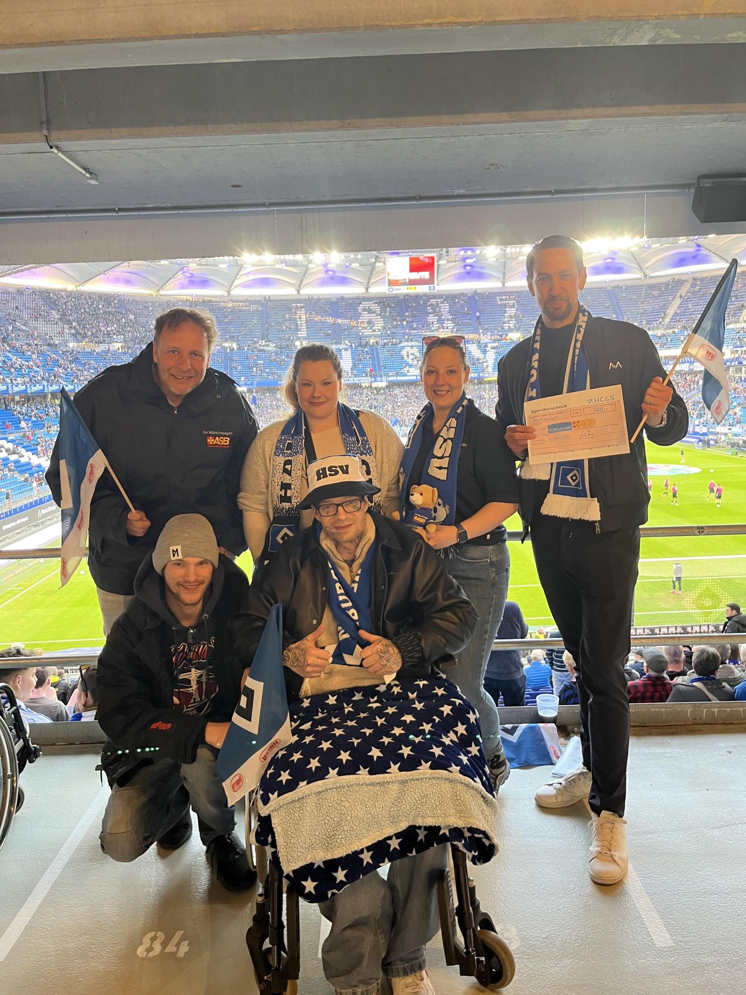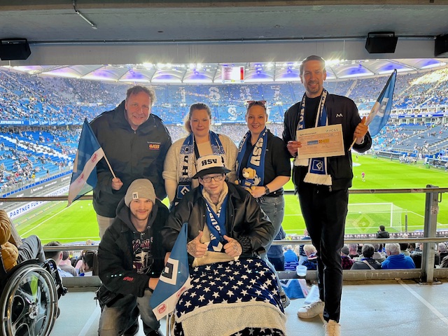 „Wer wird Deutscher Meister, ...“ - Dieses Lied wurde Anfang der 80er-Jahre vielfach in Norddeutschland gesungen. Hier war der HSV noch erstklassig! Manuel Busch aus Itzehoe ist begeisterter HSV-Fan, und als derzeit Tabellenzweiter ist die erste Liga für den HSV wieder erreichbar. Da muss die Mannschaft doch angefeuert werden, und das wurde dann auch gleich in die Tat umgesetzt, so dass Alex und Lars zusätzlich mit Bettina (Ehefrau) und Fabian (Sohn) am Freitagabend ins Volksparkstadion gefahren sind. HSV gegen den SV Elversberg, volles, ausverkauftes Haus, sehr gute Stimmung und die Farben Blau, Weiß und Schwarz dominierten das Stadion. Nach einer Stadionwurst und einem Bier feuerte Manuel seinen HSV lautstark an. Bettina und Fabian unterstützten die Schlachtrufe. Der HSV konnte während der gesamten Spielzeit insgesamt drei Lattentreffer verzeichnen – leider aber kein Tor! Immerhin aber auch kein Gegentor, so dass das Spiel unentschieden mit 0:0 ausging. Die Stimmung trübte jedoch zu keinem Zeitpunkt. Der nette Empfang des HSV-Teams, die freundliche Spende von 500,- Euro durch die HC & S sowie die geschenkte Bettwäsche für weitere Wunschfahrten zum HSV rundeten das Abendspiel bei milden Temperaturen ab. Und dann bekam Manuel noch ein ganz tolles Geschenk: Ein Stadionsitz mit den Autogrammen von allen HSV-Spielern wurde ihm in der Halbzeitpause übergeben. Eine ganz tolle Aktion! Nach dem Schlusspfiff machten wir uns nach einer ausgiebigen Spielanalyse auf den Weg nach Hause, so dass eine tolle Wunschfahrt für unseren begeisterten HSV-Fan endete.