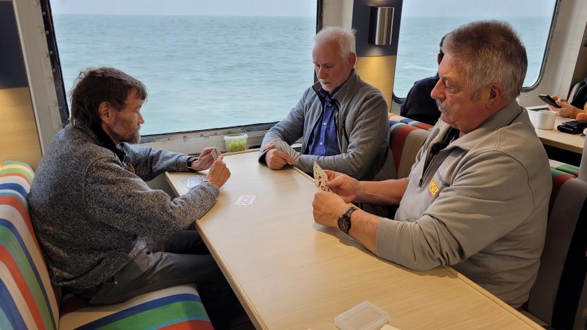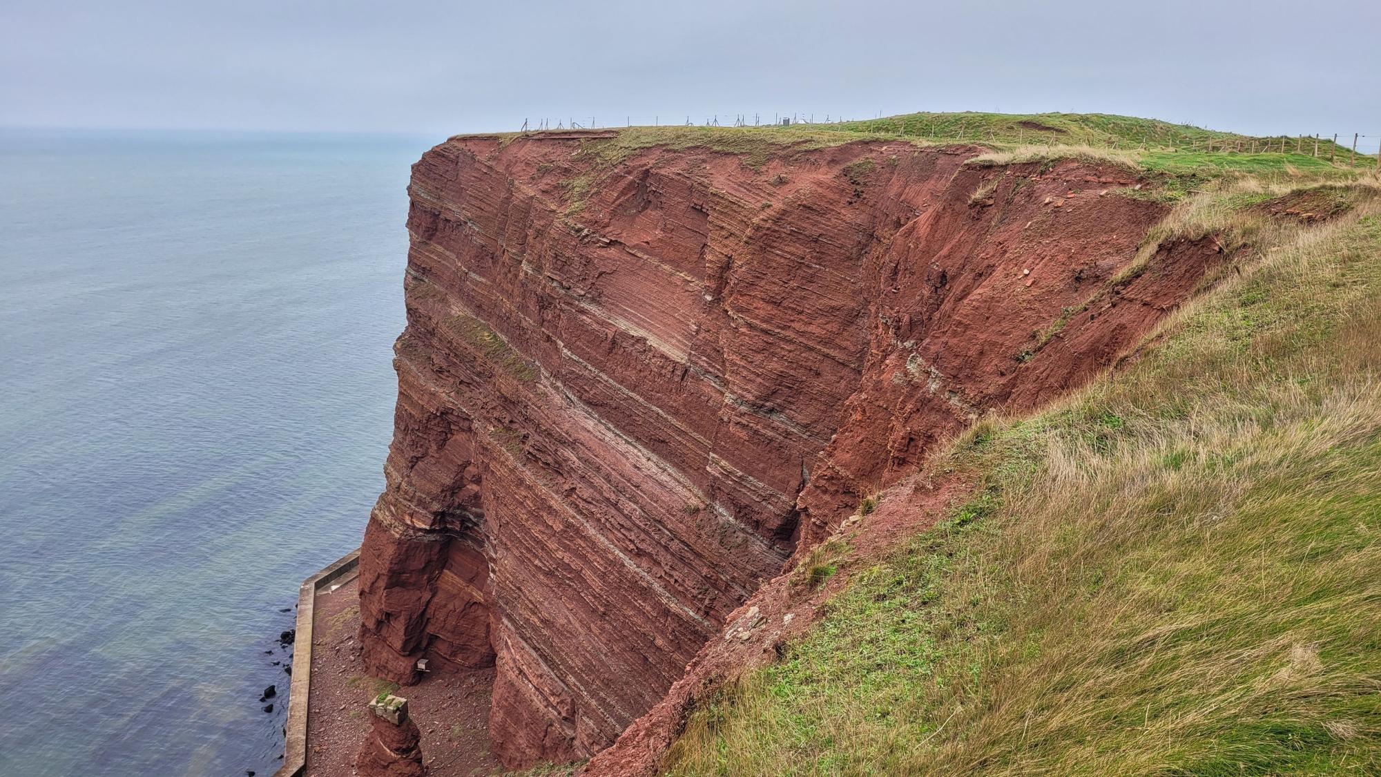 Im Halbdunkel erreichten wir den Helgolandkai in Büsum, wo wir direkt bis an die „Fair Lady“ heranfahren durften. Unsere kostenlosen Tickets hatten wir dabei, denn wir wurden von der Reederei zu dieser Fahrt eingeladen. Entgegen unseren Befürchtungen hatten wir sehr ruhige See und kaum Wellengang, sodass Zeit für ein Frühstück, einen schönen Becher Kaffee und ein paar Runden Skat war. Auf der Insel angekommen schmiedeten wir nun gemeinsam einen Plan, wohin es als erstes gehen sollte. Die Auswahl fiel unserem Fahrgast nicht besonders schwer, schließlich hat er extra für die „Lange Anna“ diese weite Reise auf sich genommen. Also machten wir uns auf ins Oberland, vorbei an den Steilküsten und den Lummenfelsen, bis wir unser Ziel erreicht hatten. Hier nahm sich Herr S. die Zeit, all die Eindrücke auf sich wirken zu lassen und in sich aufzunehmen.