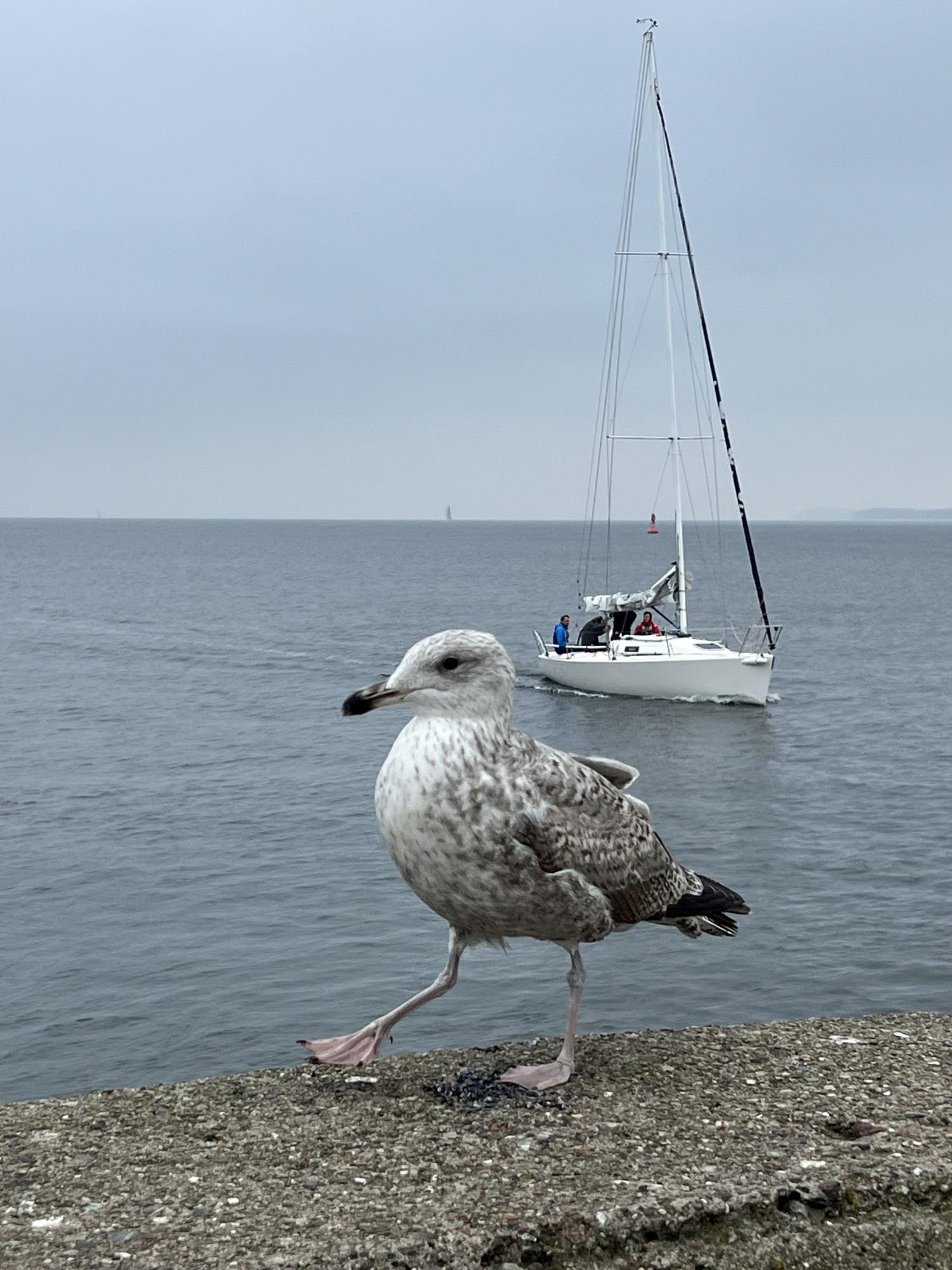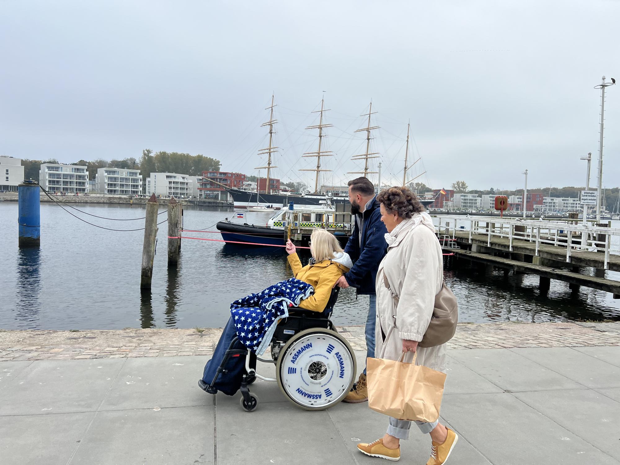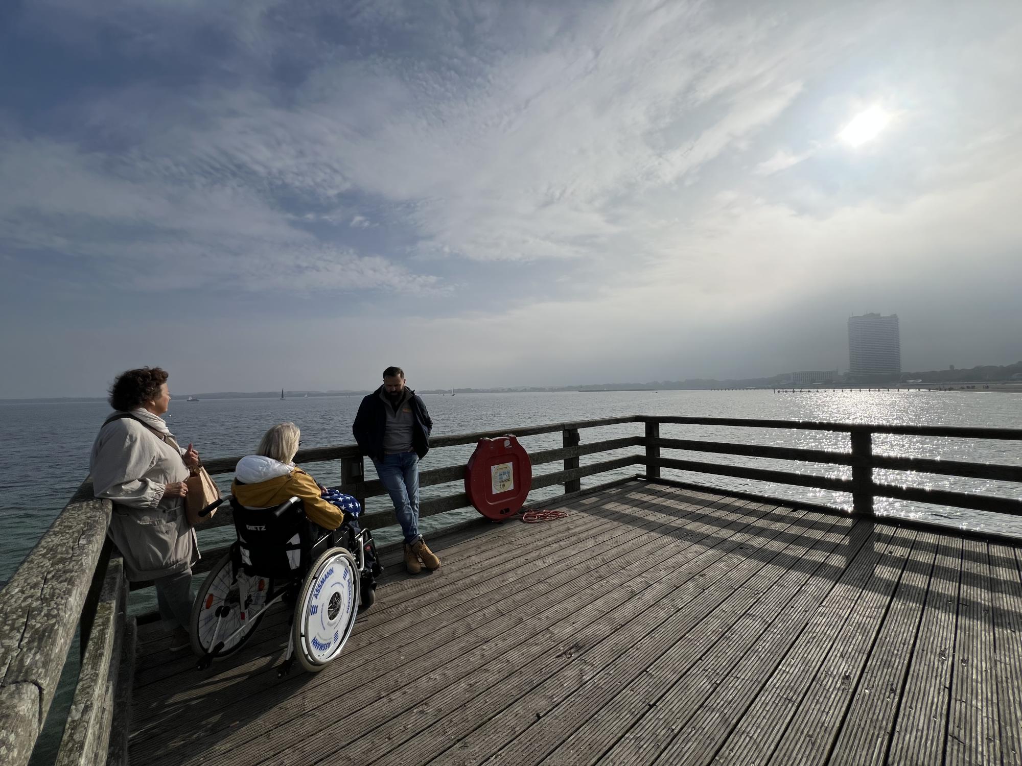 Die Stimmung im Wünschewagen war ausgelassen, und wir erreichten schon bald den Parkplatz direkt an der Promenade. Elke wurde warm eingepackt, und im Rollstuhl fuhren wir langsam Richtung Mole. Unterwegs gesellte sich eine neugierige Möwe zu uns, was Elke ein glückliches Lächeln ins Gesicht zauberte. Ein besonderes Highlight war der Delfin „Delle“, der die Aufmerksamkeit aller Spaziergänger auf sich zog – ein unvergesslicher Moment.
