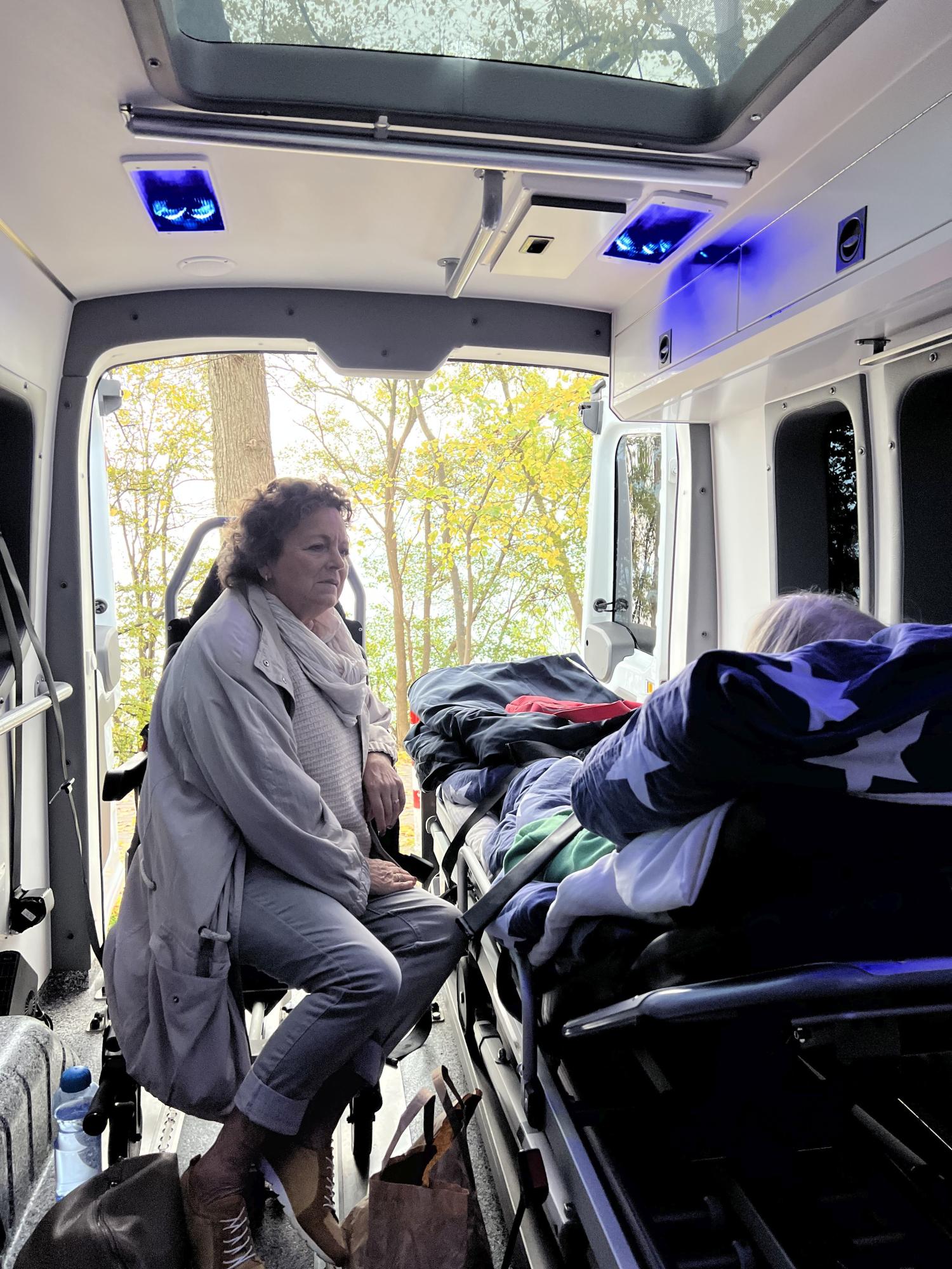 Dörnte und ich hatten die Ehre, diese Fahrt zu begleiten. Nach einer kurzen Abstimmung über Elkes medizinische Situation und einen letzten Check am Wünschewagen fuhren wir, zusammen mit einer Hospizpflegerin, zum Hospiz, wo Elke uns bereits erwartete. Sie begrüßte uns mit einem strahlenden Lächeln und stieg fast selbstständig in die bequeme Trage. Nachdem die passende Herbstjacke und ein Schal eingepackt waren, ging es los Richtung Travemünde.