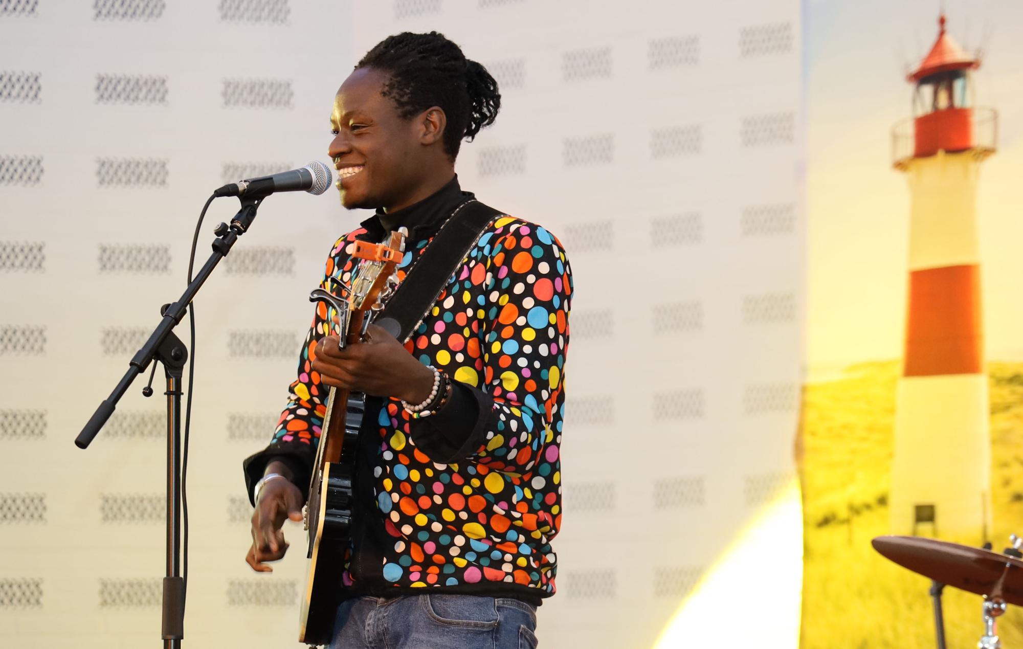 Rund wurde der Frühjahrsempfang nicht zuletzt dank der künstlerischen und kulinarischen Zutaten. Für Letzteres zeichnete das „Chili event house“ aus Itzehoe auf schmackhafteste Weise mit einem „Flying Buffet“ zuständig, Takte und Töne steuerten Jens Petersen an der Orgel und am Piano sowie Ezé Wendtoin bei. Wendtoin, in Burkina Faso geboren und studierter Germanist, erwies sich dabei als amüsanter und erfrischend (selbst-)ironischer Brückenbauer zwischen den Kulturen und Kontinenten. Als „Mensch mit Migrationsvordergrund“ fragte er sich gleich am Anfang augenzwinkernd: „Bin ich der einzigste hier, wo kein Deutsch kann?“ – und hatte sein Publikum auch schon um den Finger gewickelt.