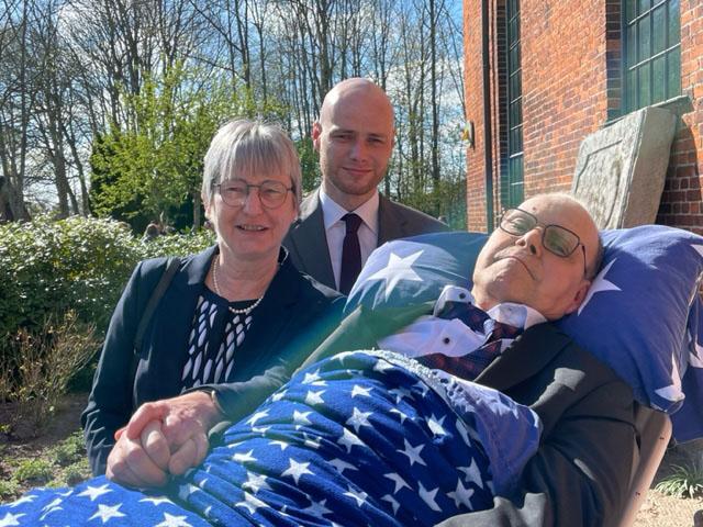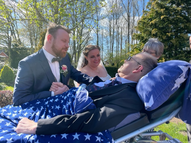 Wir reden wenig, Rainer ist müde und ein bisschen verwirrt. Er greift nach meinen Händen, „Ich möchte das spüren“, ich weiß nicht, was er meint, halte ihm aber meine Hände entgegen. Als wir ihn mittags abgeholt haben, waren wir ein bisschen nervös und aufgeregt. Jetzt sind wir vertraut im Umgang und die notwendigen Berührungen fühlen sich selbstverständlich an. Dörte ist wieder bzw. immer noch da. Alles, was wir mittags getan haben, machen wir nun in die andere Richtung. Die Krawatte hängt etwas schief, das Hemd ist zerknittert, wir legen Rainer samt Jackett zurück in sein Bett. Es ist ihm anzusehen, dass er müde ist und Schmerzen hat, jede Bewegung ist zu viel. Als wir uns für den schönen Tag bedanken, lächelt er schief und fragt, ob wir morgen wiederkommen. Leider nicht, Rainer, leider nicht. So besonders, wie die Hochzeit für das Brautpaar war, so besonders war es für uns, dabei sein zu dürfen.