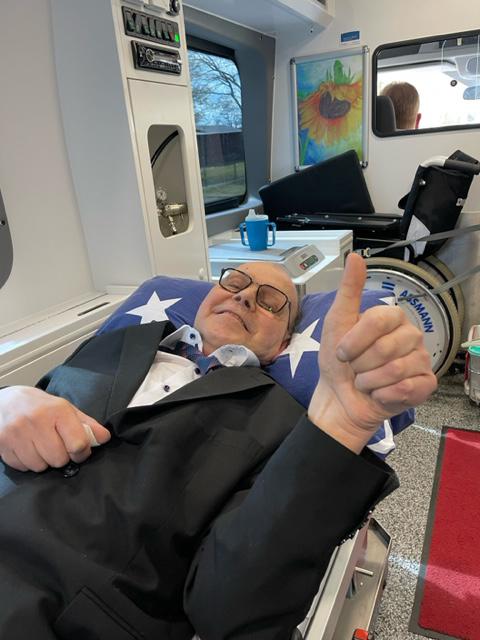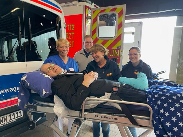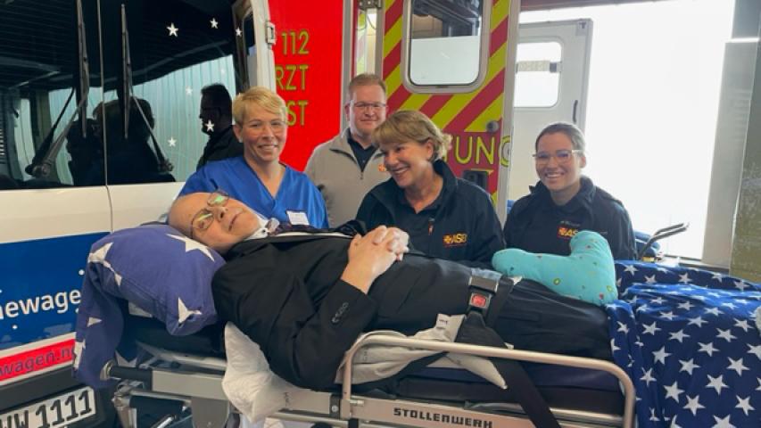 Auf dem kurzen Weg in die Imland-Klinik unterhalten wir uns über die heutige Fahrt. Rainer, unser Fahrgast, möchte an der Hochzeit seines Sohnes teilnehmen. Aufgrund seiner Erkrankung wäre das ohne Wünschewagen nicht mehr möglich, er muss liegend transportiert werden. Mit der Trage gehen wir in Rainers Zimmer und werden von Schwester Dörte herzlich begrüßt. Sie hat Rainer beim Anziehen geholfen. Ein ungewohnter Anblick in einem Krankenhausbett: weißes Hemd, schwarzes Sakko, Krawatte. Er sieht chic aus, wenn wir es nicht gewusst hätten, hätte er auch der Bräutigam sein können. Kurzes Vorstellen und eine große Überraschung: Wir wohnen in derselben Stadt! Während wir uns über Gemeinsamkeiten austauschen, verfrachten wir ihn gemeinsam mit Dörtes Hilfe auf die Trage. Die Bewegungen verursachen ihm Schmerzen, die festliche Kleidung kann nicht darüber hinwegtäuschen, dass er ein schwerkranker Mensch ist.