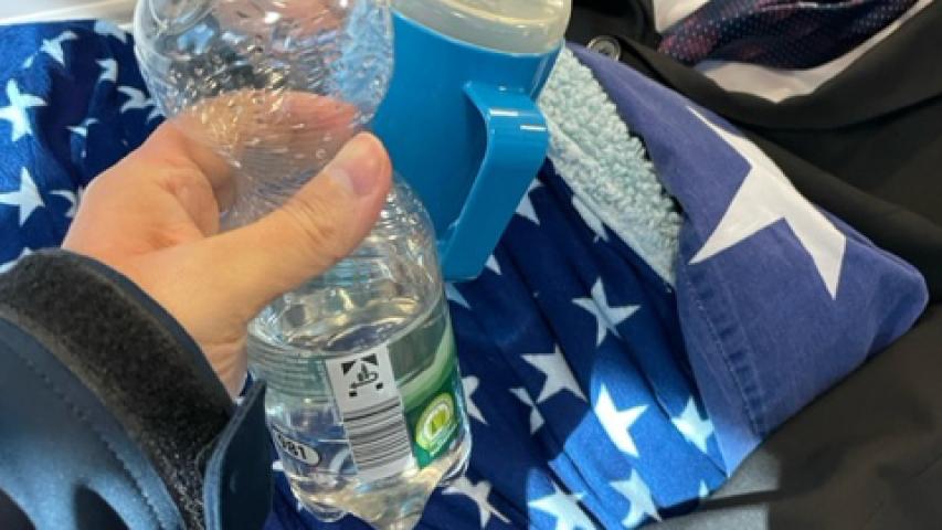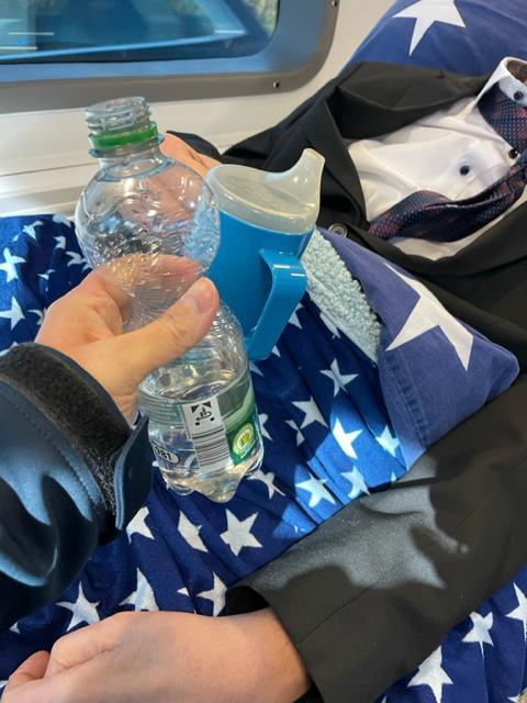 Im Wünschewagen haben wir noch einmal angestoßen. Mit Wasser, Rainer mit dem Schnabelbecher, vermutlich einem ähnlichen wie der, mit dem die Enkelin gerade selbständig trinken lernt.