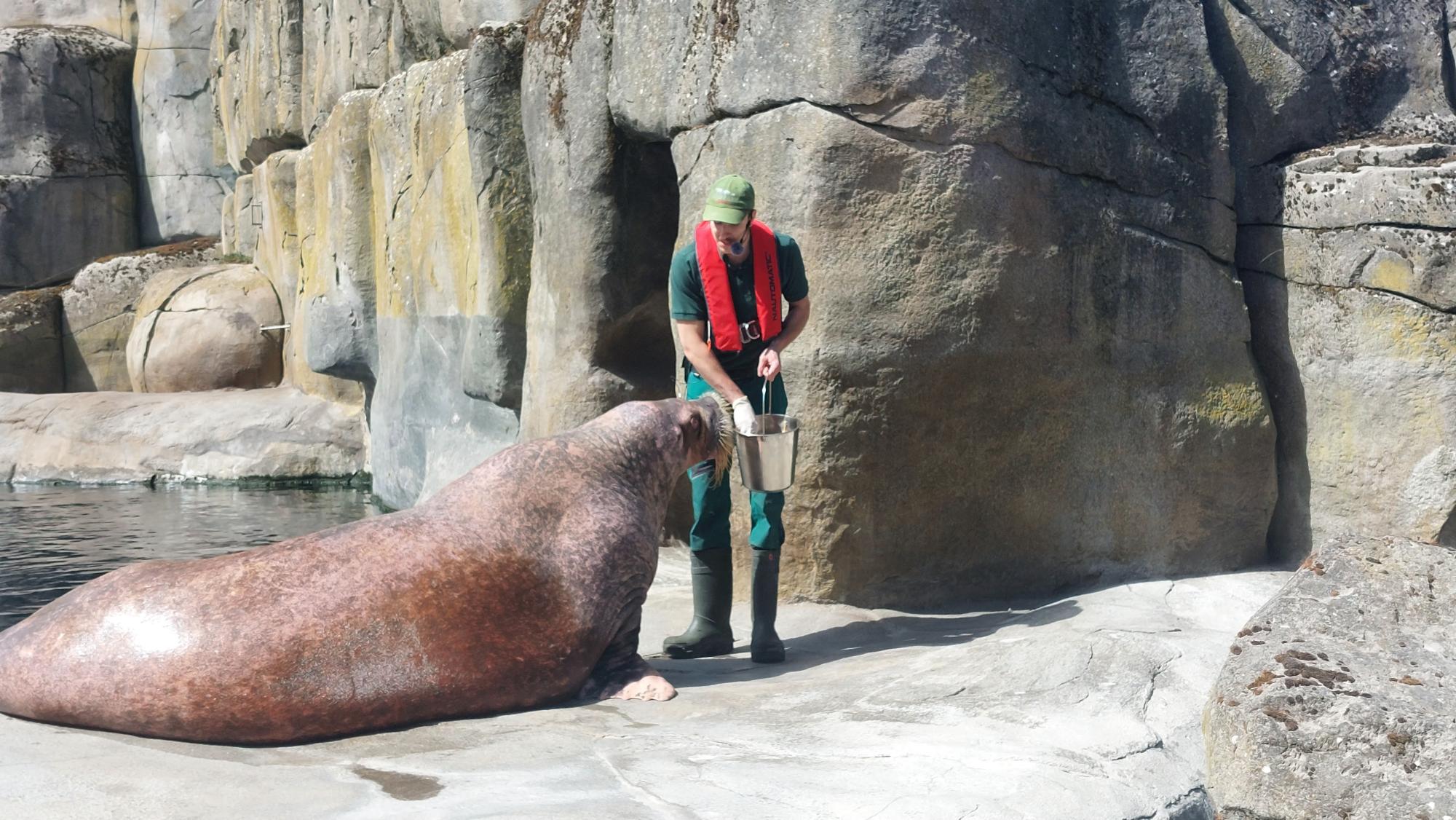 Zur Fütterung der Walrosse waren wir pünktlich am Eismeer angekommen und konnten in der ersten Reihe, mit einem Eis in der Hand, die beeindruckenden Tiere beobachten.