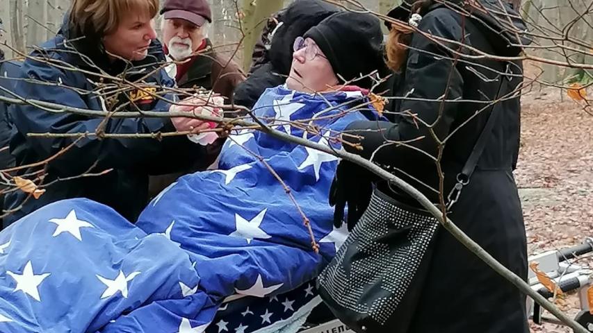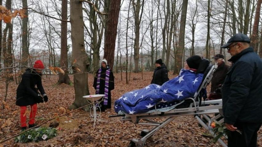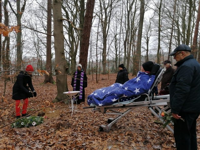 Es ist eine Herausforderung Marita samt Trage zum richtigen Ort zu bringen. Es heißt nicht umsonst FriedWALD, es ist schon zu Fuß nicht einfach zu erreichen. Die anderen Gäste sind zum Teil etwas älter und ebenfalls auf Hilfe angewiesen. Wir sind eine seltsame, kleine Trauergruppe, die sich auf den Weg macht. Marita auf der Trage, und alle, die können, helfen mit, sie zu dem Ort zu tragen, wo die Zeremonie stattfinden wird. Warm eingepackt liegt sie vor dem Altar, den die Bestatterin liebevoll geschmückt hat. Neben der Urne steht ein großes Foto von Jochen, Marita sieht es die ganze Zeit an, während die Pastorin spricht. Wir, Belinda und ich, kennen den Mann nicht, von dem hier Abschied genommen wird. Genauso wie den Großteil der Anwesenden, die wir vermutlich nach diesem Tag nie wieder sehen werden. Wir stehen etwas außerhalb, so dass wir Marita im Blick haben, aber nicht stören. Als wir „Von guten Mächten wunderbar geborgen“ singen, fühlt es sich wie etwas Gemeinsames an, so, als ob wir alle zusammen gehören.
