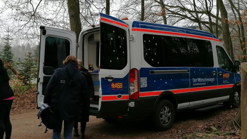 Die Fahrt zum Friedwald ist relativ kurz, ich bin mit Marita und Gesche hinten im Wünschewagen. Marita fällt das Sprechen schwer, aber ihre Gedanken sind ganz klar. Sie möchte keine Schokolade, sie möchte MonChéri. Ich muss lachen, haben wir leider nicht dabei, gebe ich an die Koordination weiter. Wir sprechen über den heutigen Tag und das, was wir tun können, damit es gelingt.