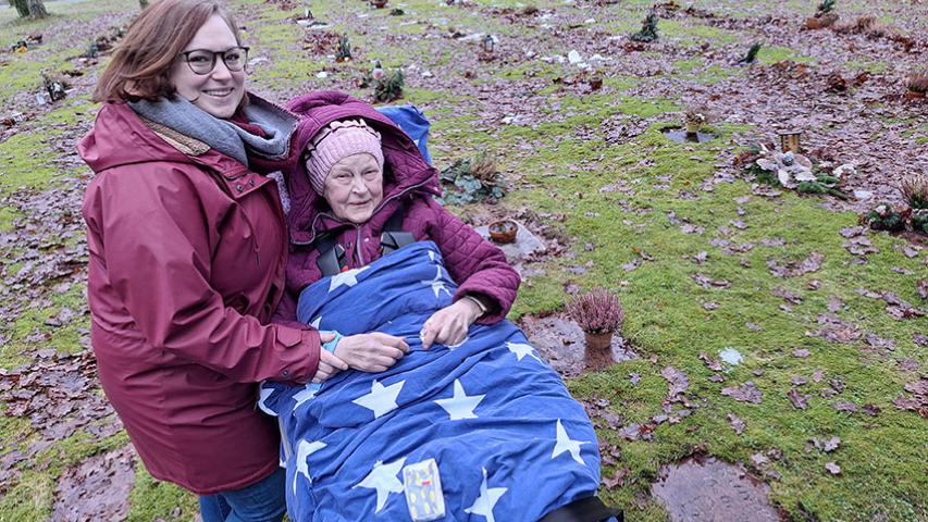 So fuhren wir nach diesem tollen Tag wieder zurück ins Hospiz, wo ein wunderschöner Blumenstrauß auf Frau H. wartete. Im Zimmer genossen wir noch eine Tasse Kaffee und Kakao, um uns wieder aufzuwärmen, bevor wir uns endgültig verabschieden mussten. Trotz einiger Bedenken vor der Fahrt, bei grauem, schlechtem Wetter über einen tristen Friedhof zu laufen, wurden wir an diesem Tag vom kompletten Gegenteil überrascht.