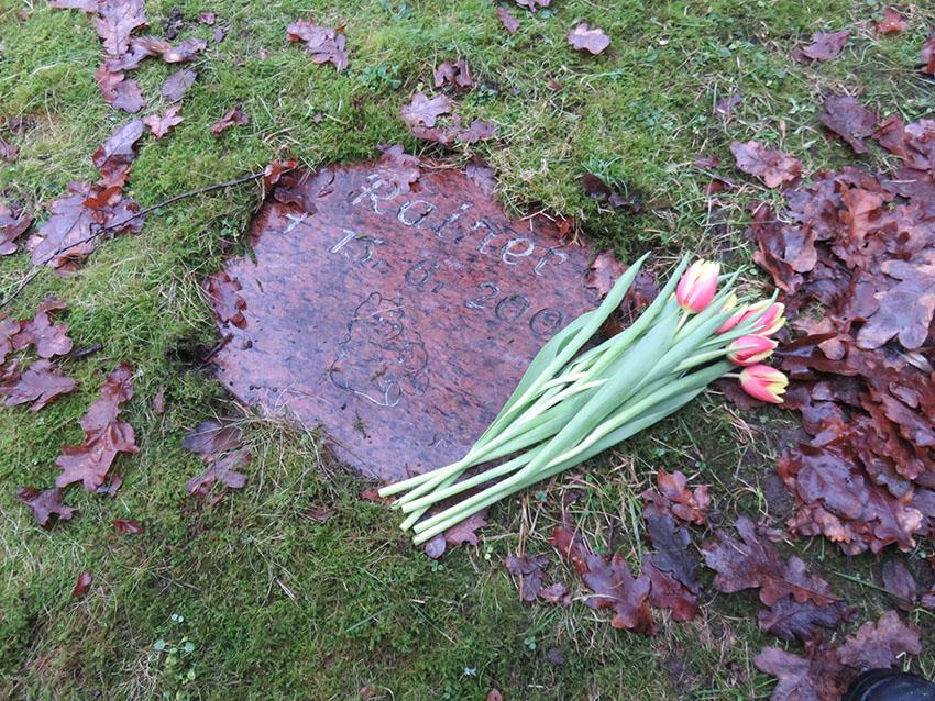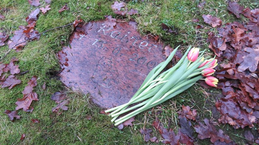 Dick eingepackt in Jacke und Decke konnte die Fahrt also starten. Nachdem sich die Suche nach dem richtigen Grab auf dem großen Bergedorfer Friedhof als gar nicht so einfach erwies und wir mit dem ASB-Wünschewagen schon eine kleine Rundfahrt über den Friedhof gemacht hatten, waren wir im zweiten Anlauf dann doch richtig – zumindest im richtigen Abschnitt. Nachdem wir zu dritt etliche Gräber von herabgefallenem Laub befreit hatten, haben wir es nach einiger Zeit endlich gefunden. Ein kleiner unscheinbarer Grabstein – mit der Skizze von Winnie Pooh.