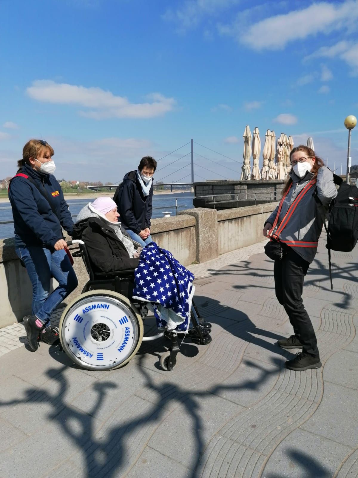 Sie schläft wie ein Stein, der Kaffee, den ich zum Frühstück geholt habe, wird kalt, weil wir sie nicht mit Gewalt wecken wollen. Im Hotel gibt es kein Frühstück, wir werden herzlich verabschiedet, holen uns etwas am Bahnhof und setzen uns mit unseren Leckereien in ein Wartehäuschen der Straßenbahn. Das Wetter meint es gut mit uns, klar, und wir laufen zum Rhein-Ufer. „Laufen“ ist ziemlich wörtlich zu nehmen, ich schiebe Marlene in einem Tempo, in dem andere Menschen vermutlich vor einem Säbelzahntiger weglaufen würden. Mein Glück ist, dass ich nicht alleine bin - ohne unseren Fahrgast werden Vera und Belinda nicht aufbrechen. Je länger wir unterwegs sind, um so mehr verfällt Marlene in ihren Dialekt, und auch wenn ich einiges gewohnt bin, muss ich häufig nachfragen. Belinda kann locker einstimmen und ich habe kurzfristig das Gefühl, dass gleich jemand Karnevalslieder spielt. Zu Marlenes großer Freude treffen wir Nina am Rhein, eine Freundin von Simone aus Kindheitstagen. Nina ist extra gekommen, um uns bzw. Marlene zu sehen. Sie ist herzlich und offen, übernimmt Marlene und den Rollstuhl und so, wie beide strahlen, haben sie eine gute Zeit. Gemeinsam, aber mit Abstand zu den beiden, damit sie sich in Ruhe unterhalten können, laufen wir das Rheinufer entlang. Wir machen Fotos, die wir Simone, Marlenes Tochter schicken, Marlene strahlt Nina an - und wir strahlen mit.