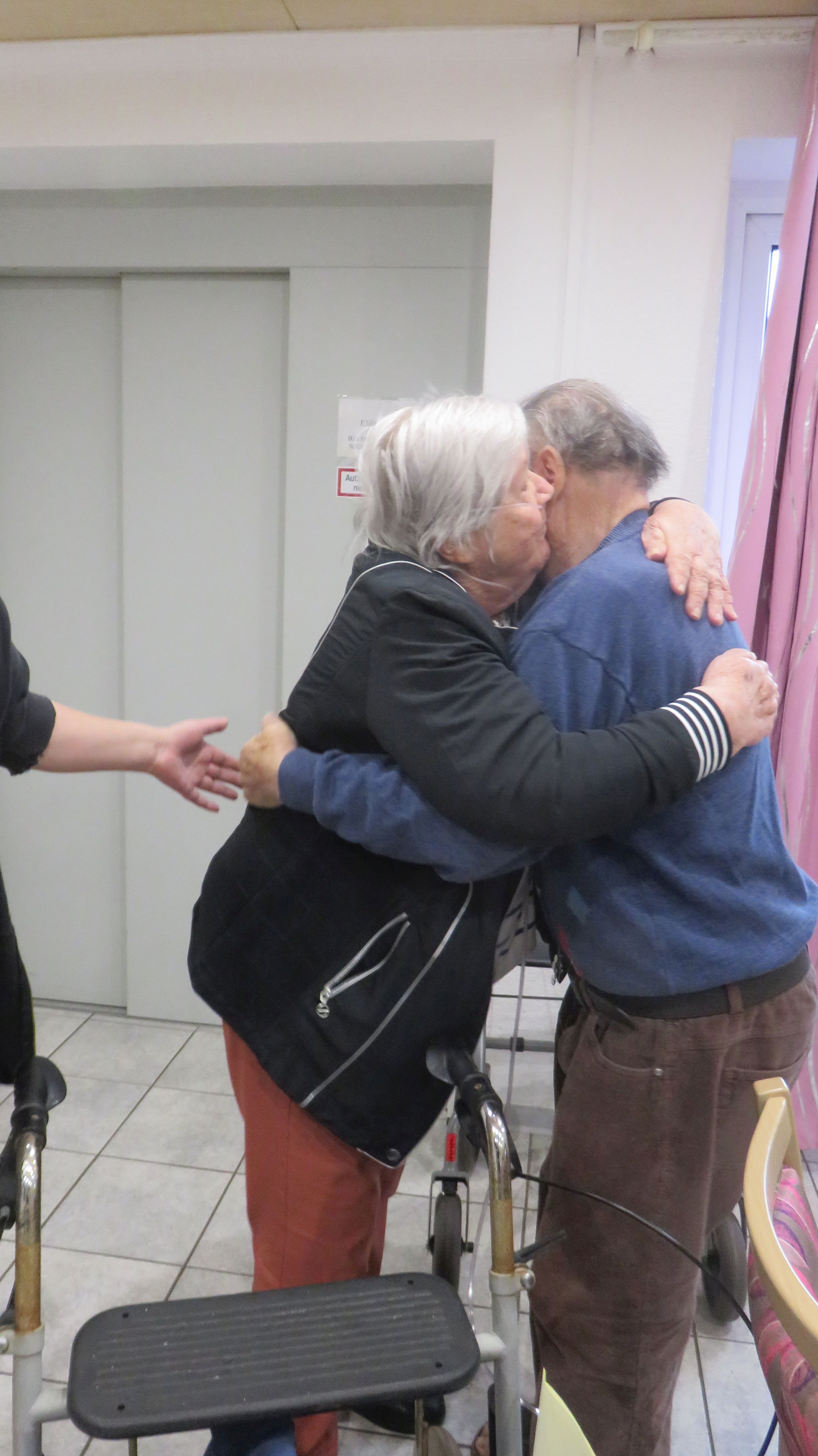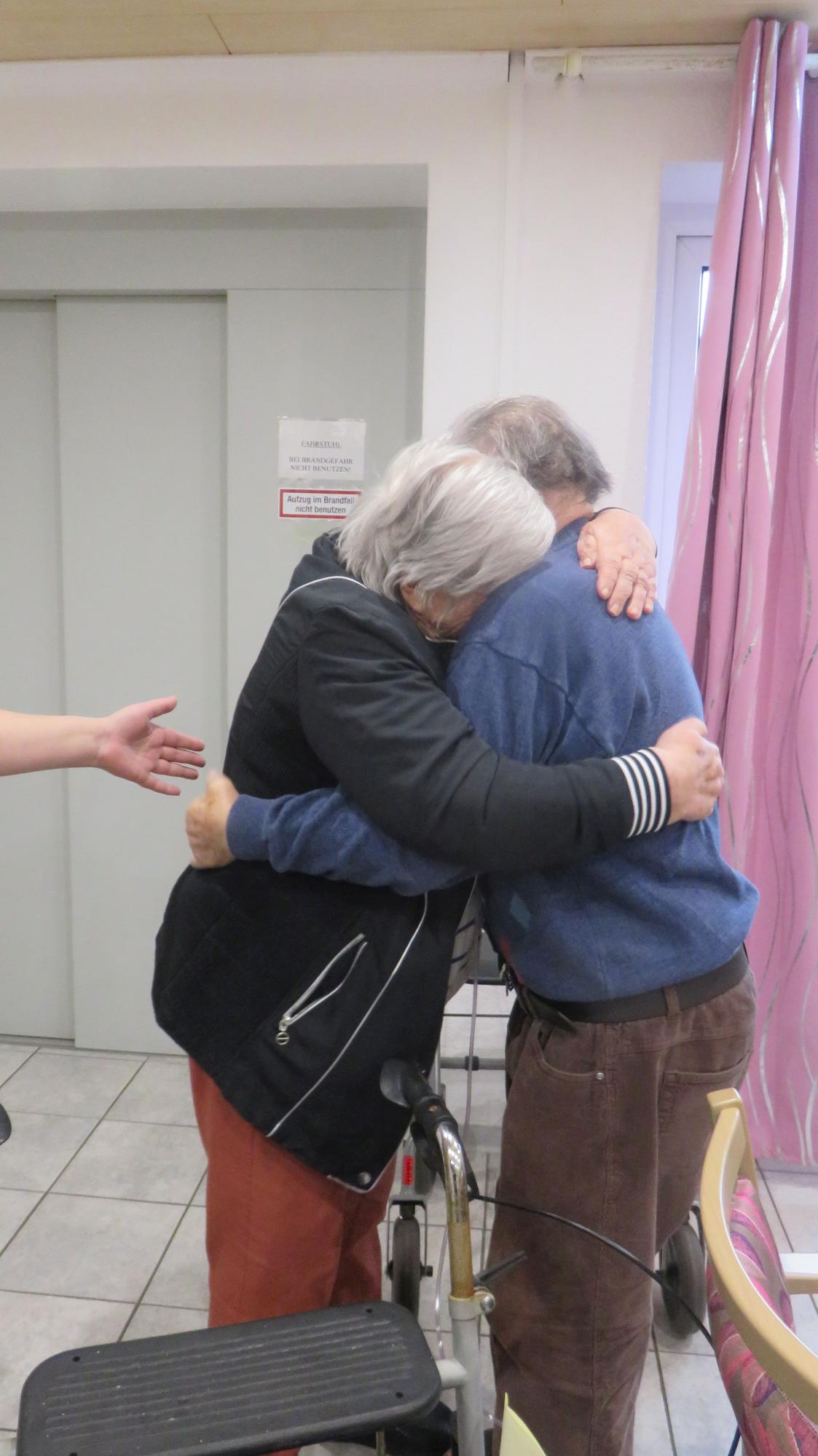 Je näher wir dem Ziel kamen, desto aufgeregter wirkte Frau B. und sagte: „Hoffentlich weine ich da nicht.“ Doch als wir im Pflegeheim von Herrn H. ankamen, fielen die Beide sich in die Arme und küssten sich herzlich. Danach sah sie ihn an und sagte: „Bist du aber klein und dünn geworden.“