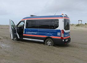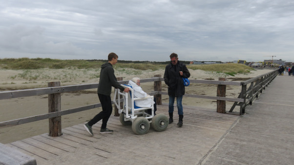 Keine Sorge, auch diese kleine Hürde im nicht immer einfachen Gelände von St. Peter Ording haben unsere Wunscherfüller mit Bravour gemeistert. Schließlich sollte es für unseren Fahrgast Frau T. und ihren ebenfalls auf den Rollstuhl angewiesenen Ehemann so nah wie möglich ans Wasser gehen – an dem Ort, wo sie in über 50 Ehejahren so viele glückliche Tage verbracht haben.