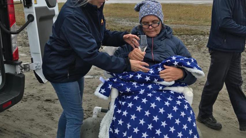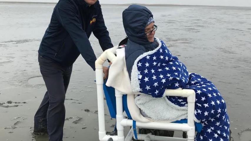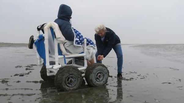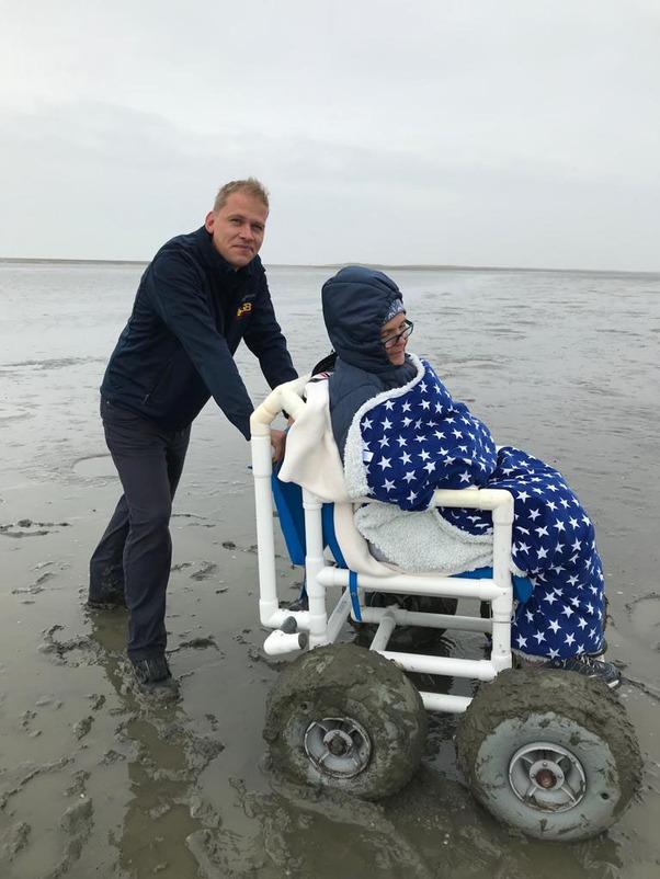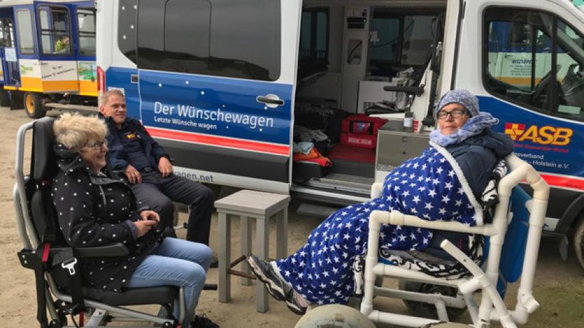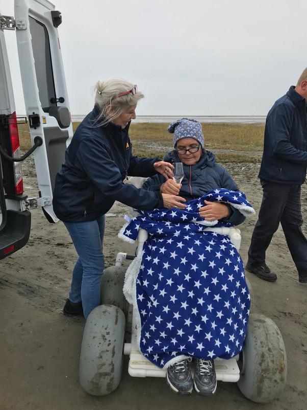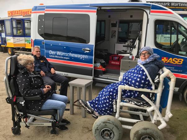 Beim Zwischenstopp in Husum genoss es die schwerkranke 56-Jährige sehr, das erste Mal wieder salzige Luft zu riechen und Schiffe zu gucken. Für unsere Wunscherfüller Andre Bredemeier und Elisabeth Klingenhoff gab es viel zu organisieren, da der Strand in Sankt Peter Ording über Nacht unbefahrbar geworden war. Also entschied man sich für den Südstrand, wo man sehr dicht ans Wasser fahren kann. Die Tourismus-Zentrale sorgte wie so oft sofort nach unserer Ankunft dafür, dass wir kostenlos einen Strandrollstuhl gebracht (!) bekamen und mit dem Wünschewagen noch etwas dichter ans Wasser durften. Ein großes Dankeschön dafür!
