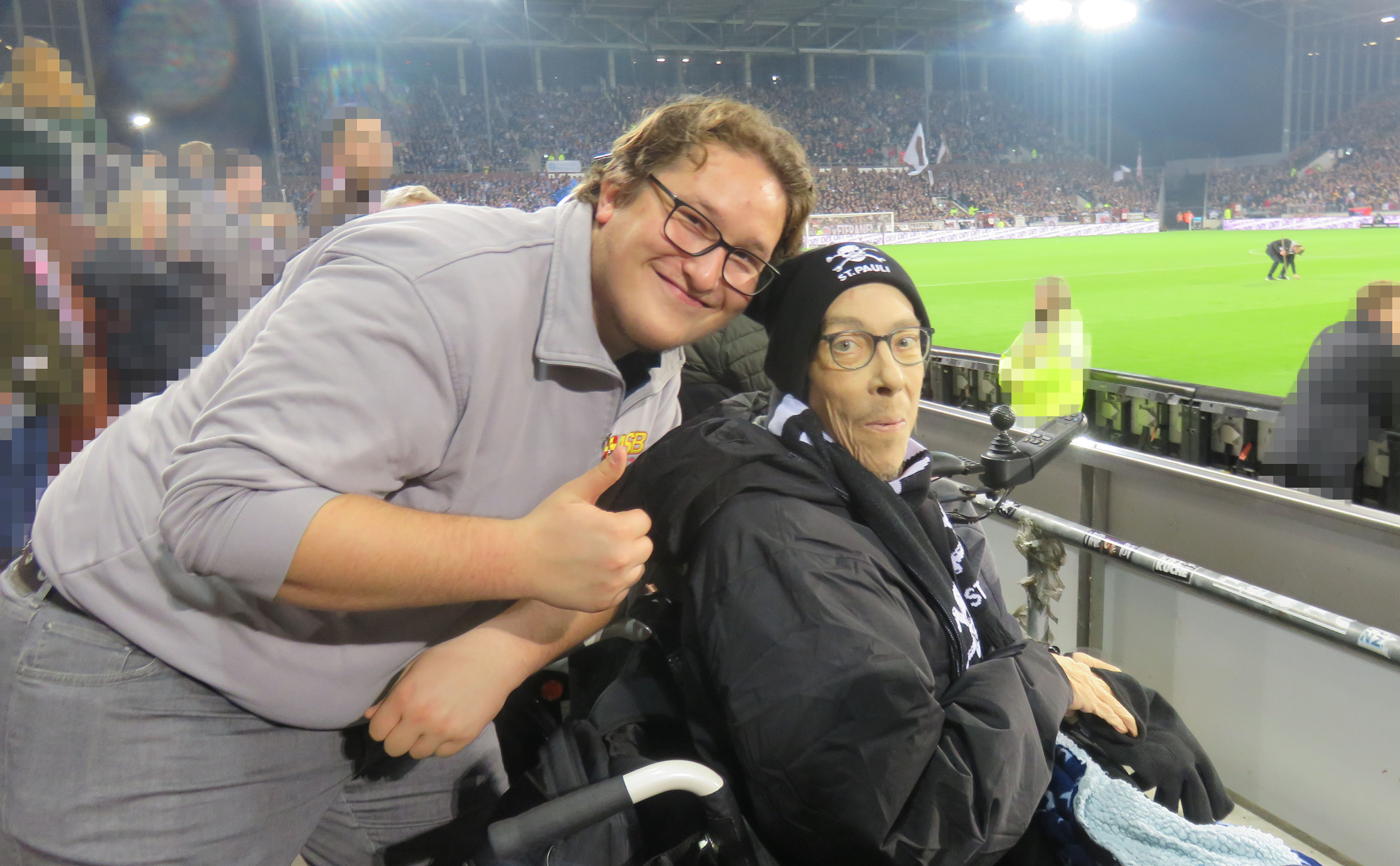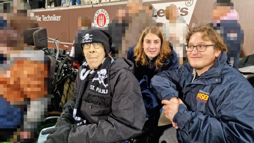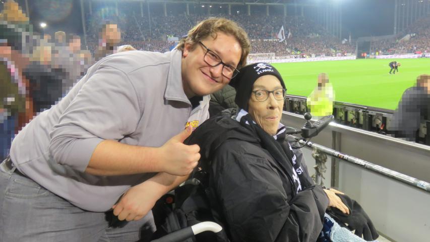 Am Ziel angekommen hat uns die Mutter von Herrn S. die Tür geöffnet und wir konnten uns ihm vorstellen. Er war sehr aufgeregt, denn das Millerntor-Stadion, genauer das Heimspiel von St. Pauli gegen Darmstadt, war das Ziel. Unser Fahrgast schaffte die Treppen hinunter zu Fuß. Per Rollstuhl ging es dann zum Wünschewagen und los ging die Reise Richtung Hamburg. Sylvia fuhr hinten bei Herrn S. mit und man hat von der Fahrerkabine schon gehört, dass die beiden sich ganz schön amüsiert haben.