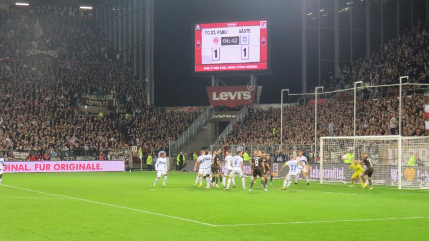 Kurz nachdem wir unseren Platz eingenommen hatten, erklangen die Hells Bells, das sind drei Glockentöne, die das Auftreten der Mannschaften ankündigen. Nur wenige Minuten später erschienen sie dann, das Team aus Darmstadt und das Team der Paulis. Die Pauli-Ultras haben die ganzen 90 Minuten richtig Stimmung gemacht, außer natürlich, als die Darmstädter ein Tor geschossen haben - dann war es sehr, sehr ruhig im Stadion. Aber kurze Zeit später fiel der Ausgleich, und dann ging die Party richtig ab.