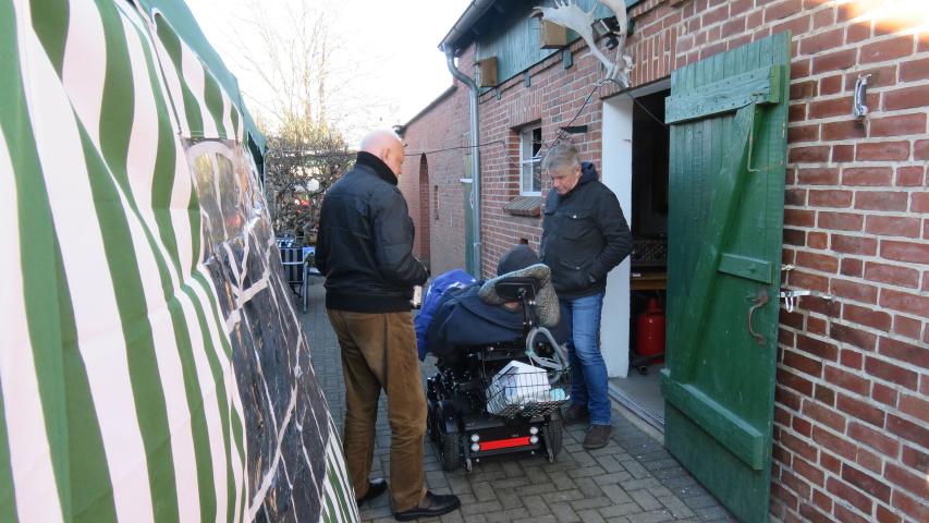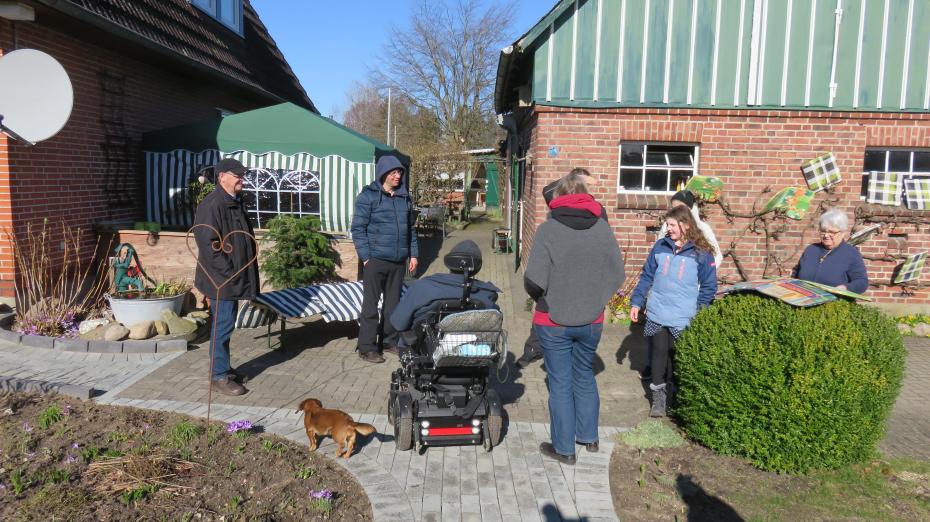 Bei bestem Wetter mit strahlender Sonne ging es dann zum ersten Ziel, dem kleinen Friedhof in Lebrade, wo er vor knapp zwei Jahren seine Mutter beerdigt hatte. Seine Ehefrau und sein Bruder mit Begleitung warteten schon auf uns und somit wurden wir drei sowie natürlich Michael herzlichst begrüßt. Einmal mit Hilfe umgesetzt in den E-Rolli machten wir uns auf den holprigen Weg zum Grab. Der Weg war leider überhaupt nicht gut geeignet für Rollstuhlfahrer, aber mit ein wenig Hilfe haben wir das alles gemeistert bekommen.