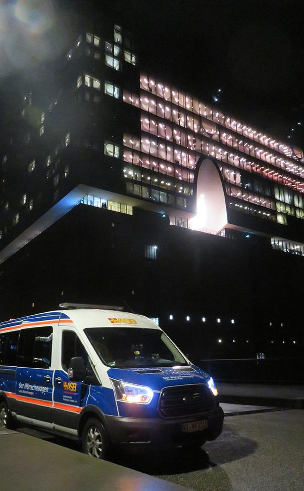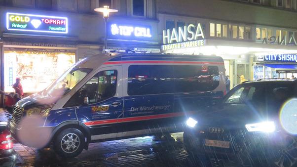 Obwohl die Abfahrt vom Wilhelminen Hospiz in Niebüll zeitlich sehr großzügig geplant war, wurde die Zeit durch die verstopften Straßen knapp und knapper. Zum Glück verfügt unser Wunscherfüller Andre über sehr viel Ortskenntnis in der Hansestadt. Da er viele Schleichwege kennt, hielt sich die unvermeidliche Verspätung, mit der unser Wünschewagen am Ziel ankam, in Grenzen. Und die Freude unseres Fahrgastes konnte sie nicht trüben, auch wenn die schwierige Anreise an seiner Kraft und den Nerven zehrte. Doch während der Vorstellung blühte Herr H. zur Freude unserer Wunscherfüller richtig auf. „Vielen Dank an euch, dass ihr uns das ermöglicht habt“, schwärmte er anschließend.