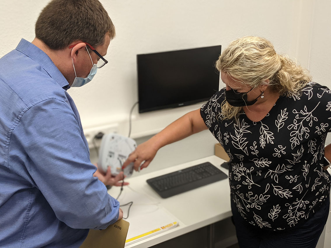 Marc Wagner erklärt Vilija Toliusiene die Funktion des beim ASB Schleswig-Holstein verwendeten Hausnotrufgerätes.