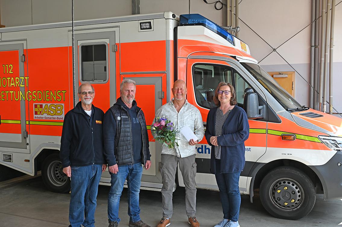 Zum 40. Dienstjubiläum am 16. Mai 2023 überbrachten Geschäftsführerin Elke Sönnichsen (rechts), der Vorstandsvorsitzende des ASB Ostholstein Jörg Bochnik (links) sowie der Leiter Rettungsdienst Hans-Jörg Will (2.v.l.) die Glückwünsche des ASB an den Jubilaren Rainer Schröder (2.v.r.). Foto ASB/S.Wriedt