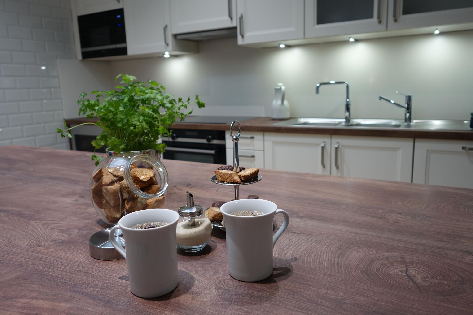 Die Wohnküche ist unser Gemeinschaftsraum. Er steht allen Menschen offen, die sich im Hospiz befinden. Er dient als Ort der Begegnung und bietet die Möglichkeit, Normalität und Alltag zu erfahren.